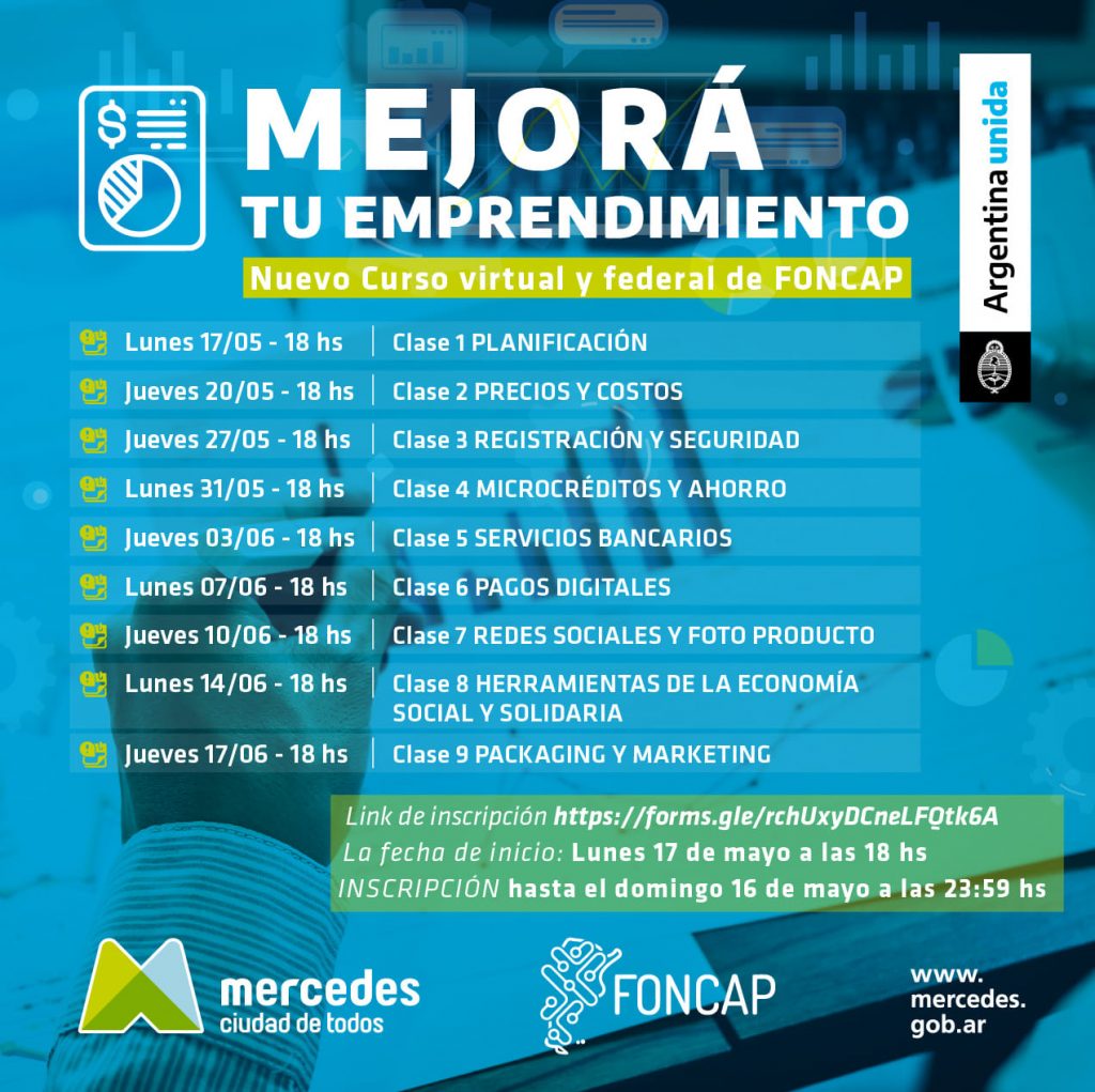 La Oficina de Empleo, dependiente de la Dirección de Producción de la Municipalidad de Mercedes, lanzó una nueva capacitación online y gratuita para Emprendedores y Emprendedoras, esta vez bajo el lema “Mejorá tu Emprendimiento”