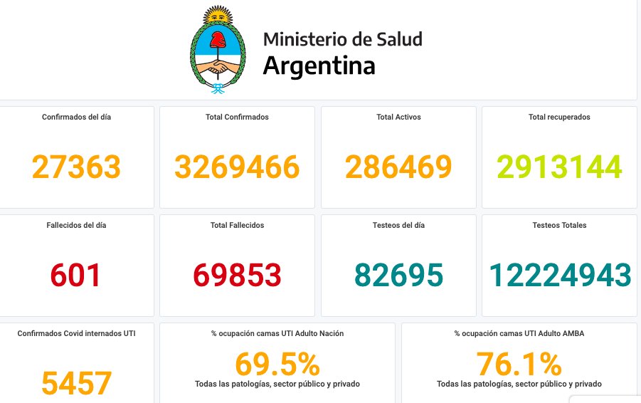 El Ministerio de Salud de la Nación informó este viernes que, en las últimas 24 horas, se registraron 601 muertes y 27.363 nuevos contagios de coronavirus. Con estos datos, el total de infectados asciende a 3.269.466 y las víctimas fatales son 69.853.