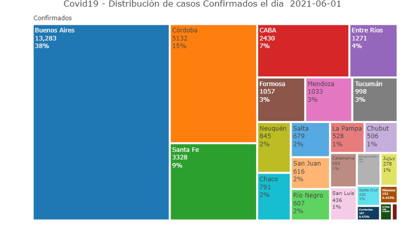 Este martes se registraron en la provincia de Buenos Aires 13.283 casos; en la Ciudad de Buenos Aires, 2.430; en Catamarca, 455; en Chaco, 791; en Chubut, 506; en Corrientes, 167; en Córdoba, 5.132; en Entre Ríos, 1.271; en Formosa, 1.057; en Jujuy, 278; en La Pampa, 528; en La Rioja, 100; en Mendoza, 1.033; en Misiones, 153; en Neuquén, 845; en Río Negro, 607; en Salta, 679; en San Juan, 616; en San Luis, 436; en Santa Cruz, 230; en Santa Fe, 3.328; en Santiago del Estero, 383; Tierra del Fuego, 49; y en Tucumán, 998.
