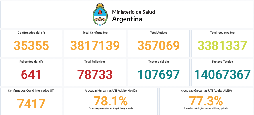 El Ministerio de Salud de la Nación informó este martes 1 de junio que, en las últimas 24 horas, se registraron 641 muertes y 35.355 nuevos contagios de coronavirus. Con estos datos, el total de casos desde el inicio de la pandemia asciende a 3.817.139 y las víctimas fatales son 78.733.