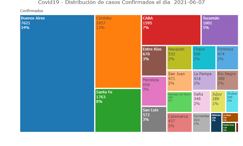 De los 22.195 contagios reportados hoy, 7.621 son de la provincia de Buenos Aires, 1.595 de la ciudad de Buenos Aires, 437 de Catamarca, 506 de Chaco, 245 de Chubut, 310 de Corrientes, 2.957 de Córdoba, 670 de Entre Ríos, 474 de Formosa, 289 de Jujuy, 418 de La Pampa, 141 de La Rioja, 658 de Mendoza, 194 de Misiones, 532 de Neuquén, 389 de Río Negro, 348 de Salta, 471 de San Juan, 572 San Luis, 119 de Santa Cruz, 1.763 de Santa Fe, 460 de Santiago del Estero, 25 de Tierra del Fuego y 1.001 de Tucumán.