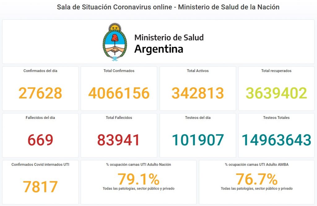 El Ministerio de Salud de Nación confirmó que este jueves el fallecimiento de 669 personas en todo el país a causa del virus que produce covid-19. Además registraron 27.628 contagios. Con estos datos, el total de casos desde el inicio de la pandemia asciende a 4.066.156 y las víctimas fatales son 83.941.
