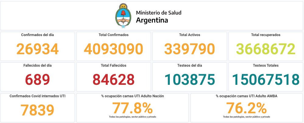 El Ministerio de Salud de la Nación informó este viernes 11 de junio que, en las últimas 24 horas, se registraron 689 muertes y 26.934 nuevos contagios de coronavirus. Con estos datos, el total de casos desde el inicio de la pandemia asciende a 4.093.090 y las víctimas fatales son 84.628.