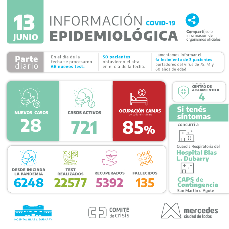 Covid: 3 fallecidos en 28 positivos en Mercedes