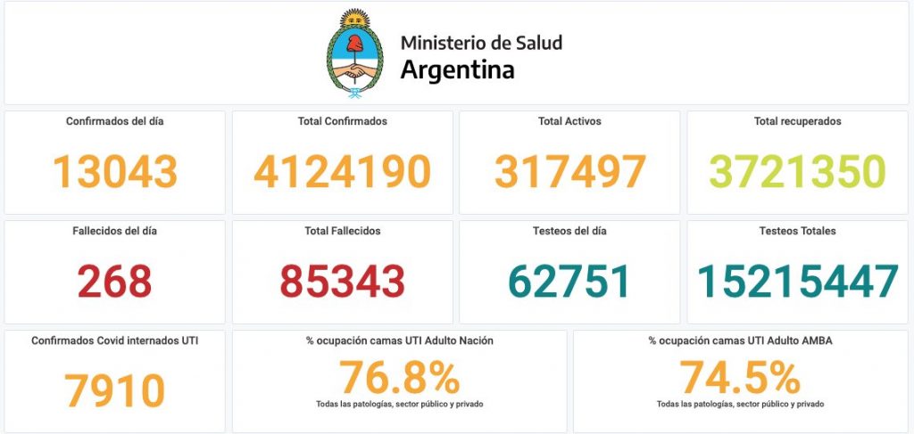 El Ministerio de Salud de la Nación informó este domingo 13 de junio que, en las últimas 24 horas, se registraron 268 muertes y 13.043 nuevos contagios de coronavirus. Con estos datos, el total de casos desde el inicio de la pandemia asciende a 4.124.190 y las víctimas fatales son 85.343.