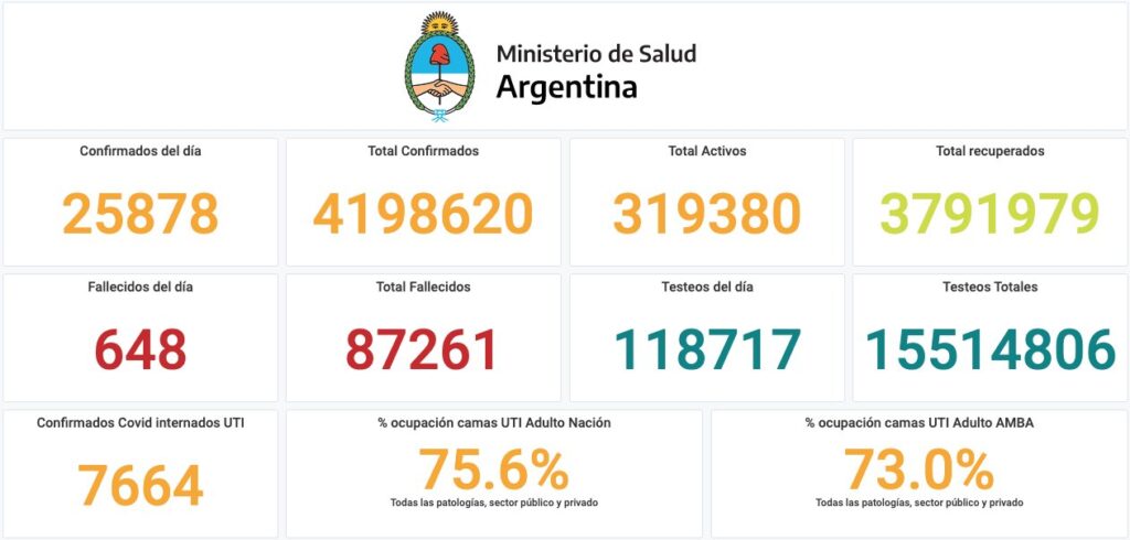 El Ministerio de Salud de la Nación informó este miércoles 16 de junio que, en las últimas 24 horas, se registraron 648 muertes y 25.878 nuevos contagios de coronavirus. Con estos datos, el total de casos desde el inicio de la pandemia asciende a 4.198.620 y las víctimas fatales son 87.261.