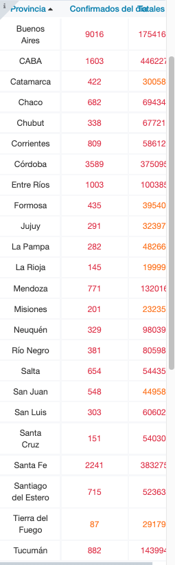 El total de acumulados por distrito indica que la provincia de Buenos Aires suma 1.754.162 casos; la Ciudad de Buenos Aires, 446.227; Catamarca, 30.058; Chaco, 69.434; Chubut, 67.721; Corrientes, 58.612; Córdoba, 375.095; Entre Ríos, 100.385; Formosa, 39.540; Jujuy, 32.397; La Pampa, 48.266; La Rioja, 19.999; Mendoza, 132.016; Misiones, 23.235; Neuquén, 98.039; Río Negro, 80.598; Salta, 54.435; San Juan, 44.958; San Luis, 60.602; Santa Cruz, 54.030; Santa Fe, 383.275; Santiago del Estero, 52.363; Tierra del Fuego, 29.179; y Tucumán, 143.994.