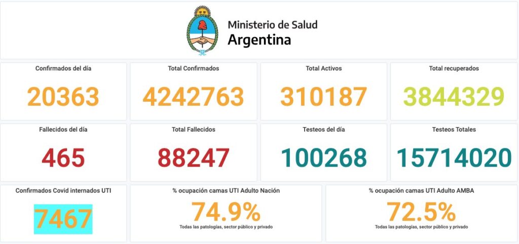 La información oficial del Ministerio de Salud confirma que fallecieron 465 personas y 20.363 fueron reportadas con coronavirus en el país. Con esas últimas cifras suman 88.247 los fallecidos y 4.242.763 los contagiados desde el inicio de la pandemia. La cartera sanitaria indicó que son 7.467 los internados con coronavirus en unidades de terapia intensiva, con un porcentaje de ocupación de camas de adultos de 74,9% en el país. El reporte consignó que fallecieron 281 hombres y 184 mujeres.