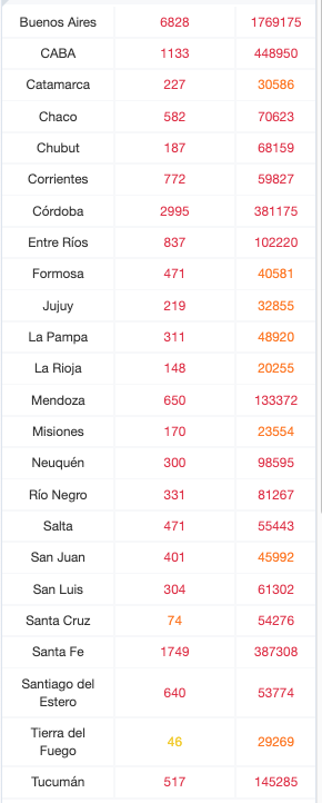 Del total de muertes de los hombres, 84 son de la provincia de Buenos Aires, 26 de la ciudad de Buenos Aires, siete de Catamarca, 16 de Chaco, 10 de Chubut, seis de Corrientes, 20 de Córdoba, 20 de Entre Ríos, siete de Formosa, cuatro de Jujuy, tres de La Pampa, 11 de Mendoza, cuatro de Misiones, ocho de Neuquén, seis de Río Negro, 13 de Salta, uno de San Juan, dos de San Luis, uno de Santa Cruz, 25 de Santa Fe, tres de Santiago del Estero y cuatro de Tucumán. En tanto de las fallecidas confirmadas hoy, 58 son de la provincia de Buenos Aires, 12 de la ciudad de Buenos Aires, 10 de Catamarca, siete de Chaco, siete de Chubut, una de Corrientes, 18 de Córdoba, 10 de Entre Ríos, una de Formosa, una de Jujuy, ocho de La Pampa, cinco de Mendoza, dos de Misiones, siete de Neuquén, tres de Río Negro, 10 de Salta, tres de San Juan, dos de San Luis, una de Santa Cruz, 12 de Santa Fe, cinco de Santiago del Estero y una de Tucumán).