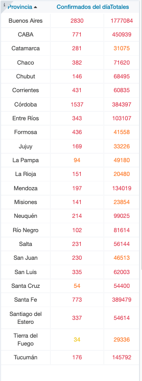 El total de acumulados por distrito indica que la provincia de Buenos Aires suma 1.777.084 casos; la Ciudad de Buenos Aires, 450.939; Catamarca, 31.075; Chaco, 71.620; Chubut, 68.495; Corrientes, 60.835; Córdoba, 384.397; Entre Ríos, 103.107; Formosa, 41.558; Jujuy, 33.226; La Pampa, 49.180; La Rioja, 20.480; Mendoza, 134.019; Misiones, 23.854; Neuquén, 99.025; Río Negro, 81.614; Salta, 56.144; San Juan, 46.513; San Luis, 62.003; Santa Cruz, 54.400; Santa Fe, 389.479; Santiago del Estero, 54.614; Tierra del Fuego, 29.336; y Tucumán, 145.792.