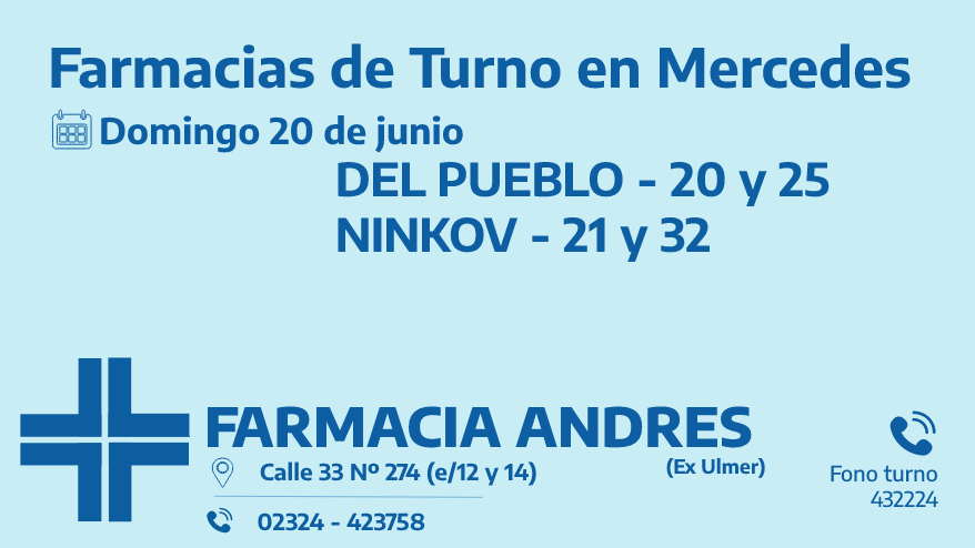 Farmacias de turno del domingo 20 de junio 20 junio, 2021Desde las 8:30 del día de hoy, hasta la misma hora de mañana, las farmacias de turno en Mercedes son: Del Pueblo y Ninkov.Comparte esto: Haz clic para compartir en WhatsApp (Se abre en una ventana nueva) WhatsApp Haz clic para compartir en Telegram (Se abre en una ventana nueva) Telegram Haz clic para compartir en X (Se abre en una ventana nueva) X Haz clic para compartir en Facebook (Se abre en una ventana nueva) Facebook TE PUEDE INTERESARCOMENTARIOS Comentarios