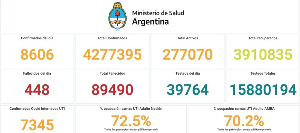 El Ministerio de Salud de la Nación informó este lunes 21 de junio que, en las últimas 24 horas, se registraron 448 muertes y 8.606 nuevos contagios de coronavirus. Suman 89.490 los muertos registrados oficialmente a nivel nacional y 4.277.395 los contagiados desde el inicio de la pandemia.