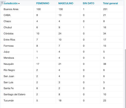 Del total de muertes, 265 son hombres (130 de la provincia de Buenos Aires, 13 de la ciudad de Buenos Aires, 4 Chaco, 9 de Chubut, 24 de Córdoba, 10 de Entre Ríos, 7 de Formosa, 4 de Jujuy, 4 de Mendoza, 21 de Neuquén, 4 de Río Negro, 4 de San Juan, 3 de San Luis, 2 de Santa Fe, 8 de Santiago del Estero y 18 de Tucumán) y 181 son mujeres (100 de la provincia de Buenos Aires, 8 de la ciudad de Buenos Aires, 4 de Chaco, 6 de Chubut, 10 de Córdoba, 7 de Entre Ríos, 8 de Formosa, 1 de Jujuy, 1 de Mendoza, 17 de Neuquén, 2 de Río Negro, 2 de San Juan, 2 de San Luis, 6 de Santa Fe, 2 de Santiago del Estero y 5 de Tucumán). Dos personas, una de la provincia de Buenos Aires y una de la provincia de Chubut, fueron registradas sin datos de sexo.