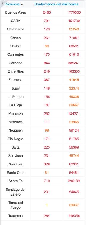 El total de acumulados por distrito indica que la provincia de Buenos Aires suma 1.779.550 casos; la Ciudad de Buenos Aires, 451.730; Catamarca, 31.248; Chaco, 71.881; Chubut, 68.591; Corrientes, 61.010; Córdoba, 385.241; Entre Ríos, 103.353; Formosa, 41.945; Jujuy, 33.374; La Pampa, 49.338; La Rioja, 20.667; Mendoza, 134.271; Misiones, 23.965; Neuquén, 99.124; Río Negro, 81.785; Salta, 56.369; San Juan, 46.744; San Luis, 62.331; Santa Cruz, 54.451; Santa Fe, 390.189; Santiago del Estero, 54.845; Tierra del Fuego, 29.337 y Tucumán, 146.056.
