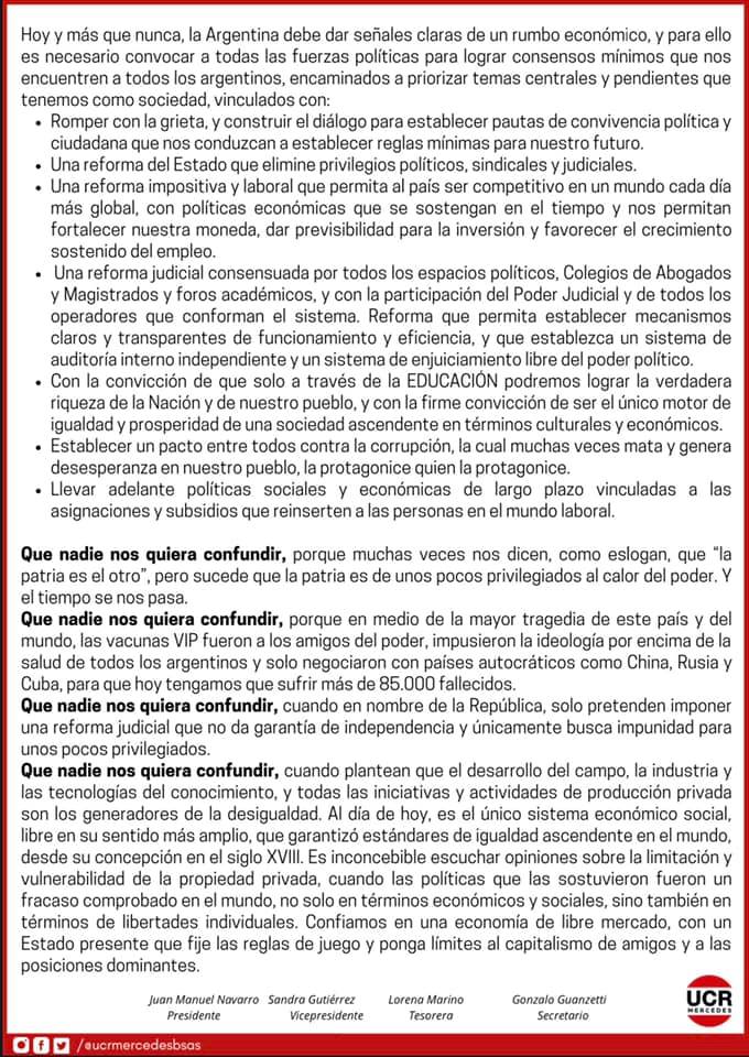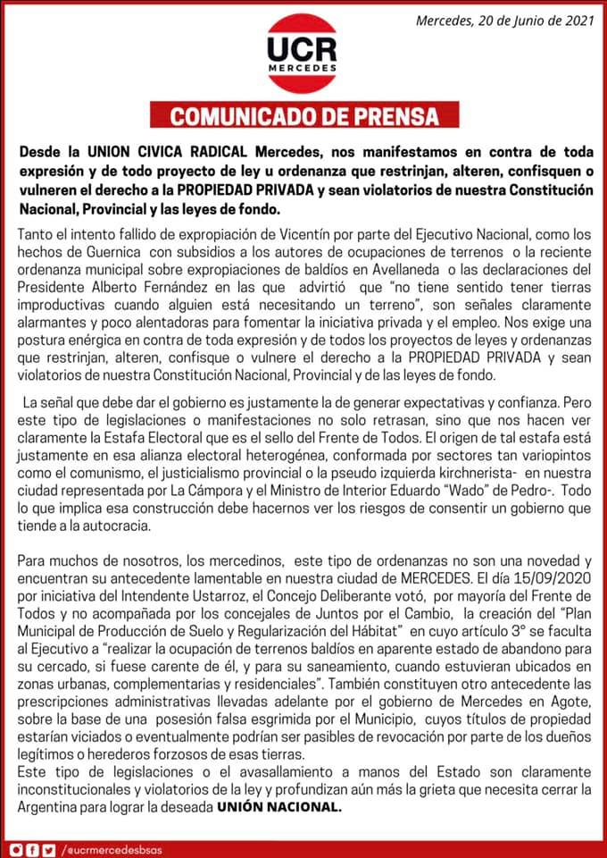 A través de una comunicación enviada a los medios de comunicación, la Unión Cívica Radical Mercedes manifiesta su oposicióna a «toda expresión y de todo proyecto de ley u ordenanza que restrinjan, alteren, confisquen o vulneren el derecho a la propiedad privada y sean violatorios de nuestra Constitución Nacional, Provincial y las leyes de fondo».