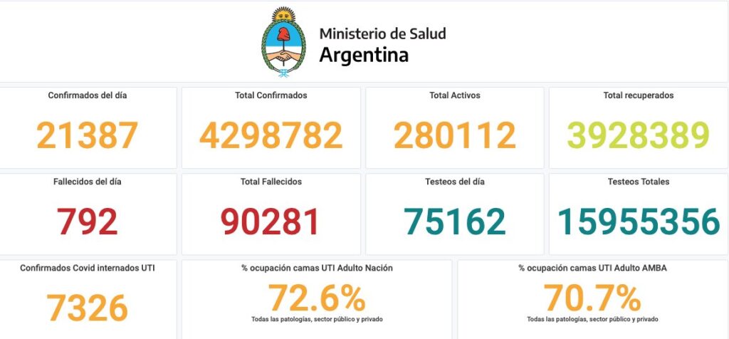 El Ministerio de Salud confirmó el fallecimiento de 792 personas y de 21.387 nuevos casos en las últimas 24 horas. Con estas cifras, el número de fallecidos desde el comienzo de la pandemia llegó este martes a 90.281 personas y los contagiados ascendieron a 4.298.782.