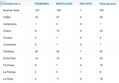 Del total de muertes, 464 son hombres (193 de la provincia de Buenos Aires, 37 de la ciudad de Buenos Aires, 15 de Chaco, uno de Chubut, uno de Corrientes, 50 de Córdoba, 15 de Entre Ríos, siete de Formosa, cinco de La Pampa, 11 de La Rioja, nueve de Mendoza, uno de Misiones, 31 de Neuquén, cinco de Río Negro, 16 de Salta, seis de San Juan, ocho de San Luis, dos de Santa Cruz, 40 de Santa Fe, ocho de Santiago del Estero, uno de Tierra del Fuego y dos de Tucumán) y 323 son mujeres (157 de la provincia de Buenos Aires, 16 de la ciudad de Buenos Aires, uno de Catamarca, nueve de Chaco, dos de Chubut, 36 de Córdoba, 10 de Entre Ríos, nueve de Formosa, dos de La Pampa, cinco de La Rioja, tres de Mendoza, tres de Misiones, 17 de Neuquén, siete de Río Negro, seis de Salta, cuatro de Santa Juan, cuatro de San Luis, 32 de Santa Fe y dos de Santiago del Estero). Tres personas (una de provincia de Buenos Aires, una de Córdoba y una de La Pampa) fueron registradas sin datos de sexo.