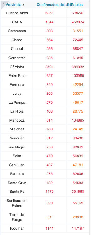 El total de acumulados por distrito indica que la provincia de Buenos Aires suma 1.786.501 casos; la Ciudad de Buenos Aires, 453.074; Catamarca, 31.551; Chaco, 72.445; Chubut, 68.847; Corrientes, 61.943; Córdoba, 389.032; Entre Ríos, 103.980; Formosa, 42.292; Jujuy, 33.577; La Pampa, 49.617; La Rioja, 20.775; Mendoza, 134.885; Misiones, 24.145; Neuquén, 99.436; Río Negro, 82.041; Salta, 56.839; San Juan, 41.181; San Luis, 62.606; Santa Cruz, 54.583; Santa Fe, 391.668; Santiago del Estero, 55.165; Tierra del Fuego, 29.398 y Tucumán, 147.197.