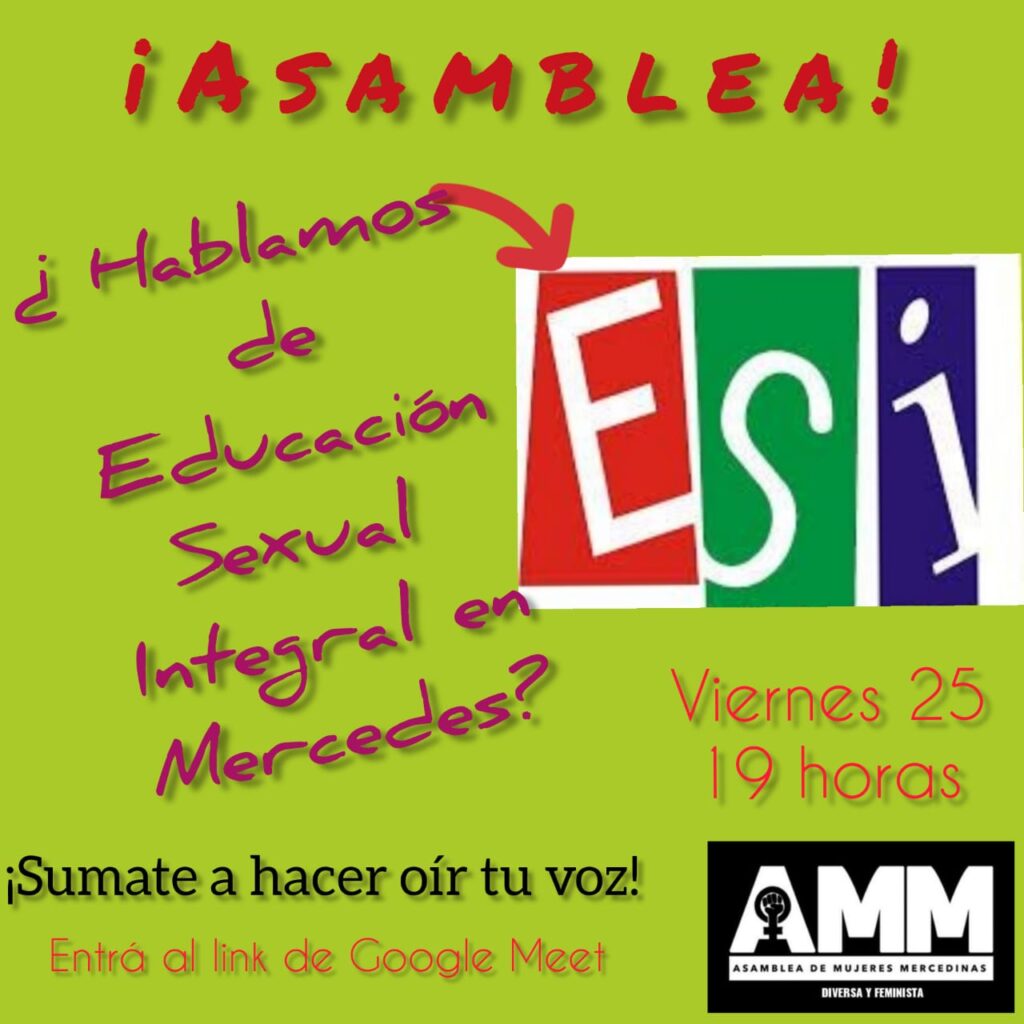 Desde la Asamblea de Mujeres Mercedinas Diversa y Feminista convocan para este viernes 25 de junio, 19 horas, a una asamblea abierta con modalidad virtual, (mediante la plataforma Meet) para dialogar sobre Educación Sexual Integral y su implementación en la ciudad de Mercedes.