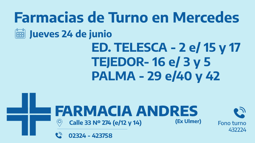Desde las 8:30 del día de hoy, hasta la misma hora de mañana, las farmacias de turno en Mercedes son: Eduardo Telesca, Tejedor y Palma.