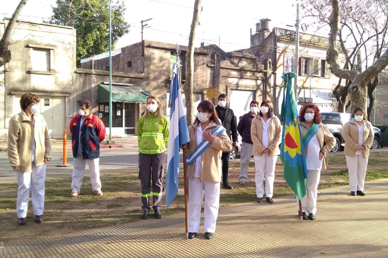 Cabe destacar que la bandera de ceremonia fue llevada por representantes del sistema sanitario de la ciudad, entre ellos enfermeros del Hospital Dubarry y parte del equipo de SAME.