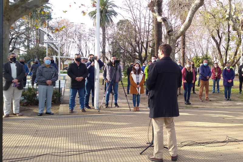 En el acto breve se colocó una sola ofrenda floral a nombre de la comuna y el único orador fue el Jefe Comunal Juan Ignacio Ustarrzo que resaltó el trabajo mancomunado de los distintos sectores sociales, civiles, políticos, gubernamentales, empresariales y sanitarios durante el año y medio que transitamos la pandemia.