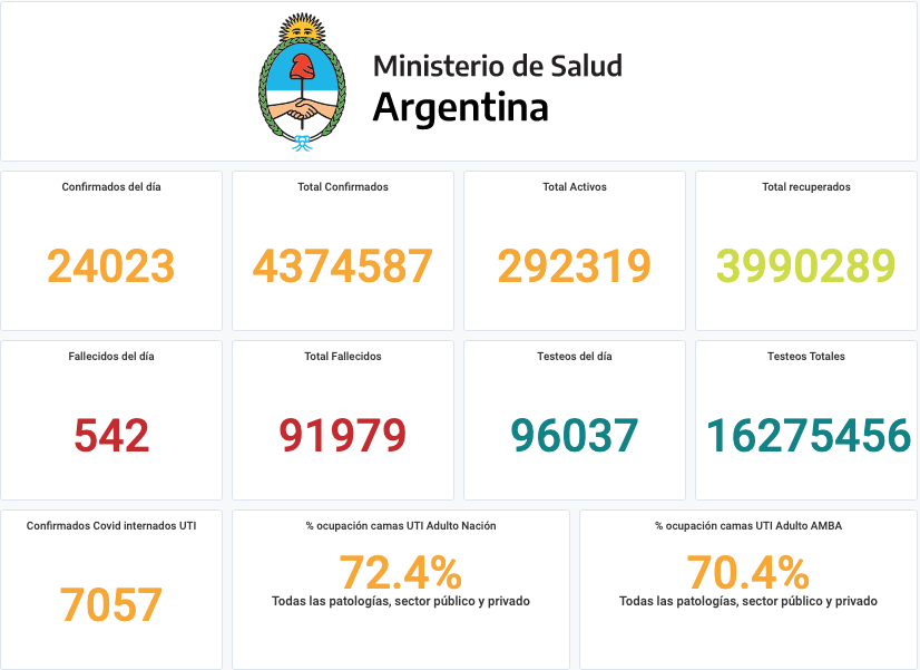 El Ministerio de Salud de la Nación informó este viernes 25 de junio que, en las últimas 24 horas, se registraron 542 muertes y 24.023 nuevos contagios de coronavirus. Con estos datos, el total de casos desde el inicio de la pandemia asciende a 4.374.587 y las víctimas fatales son 91.979.