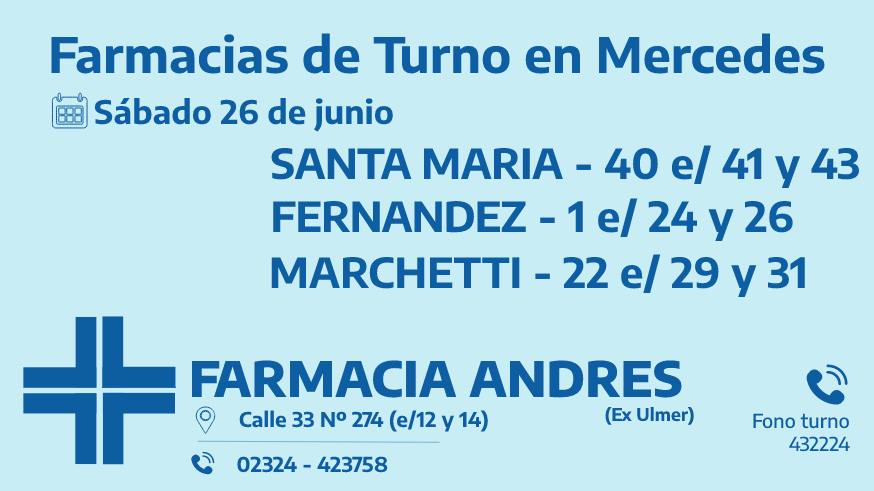 Desde las 8:30 del día de hoy hasta la misma hora de mañana, las farmacias de turno en Mercedes son: Santa María, Fernández y Marchetti.