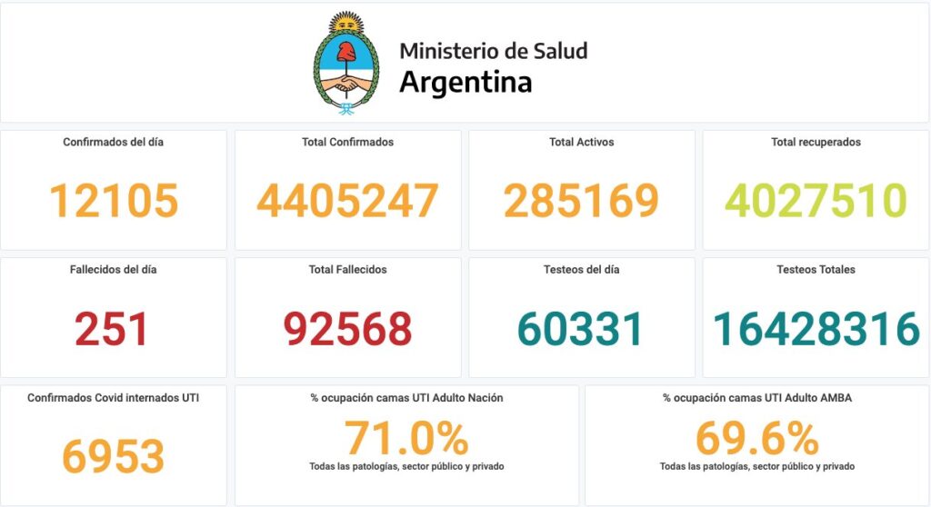EL Ministerio de Salud de Nación informó que 251 personas fallecieron y 12.105 fueron reportadas con coronavirus en las últimas 24 horas en la Argentina, con lo que suman 92.568 los fallecidos registrados oficialmente a nivel nacional y 4.405.247 los contagiados desde el inicio de la pandemia.