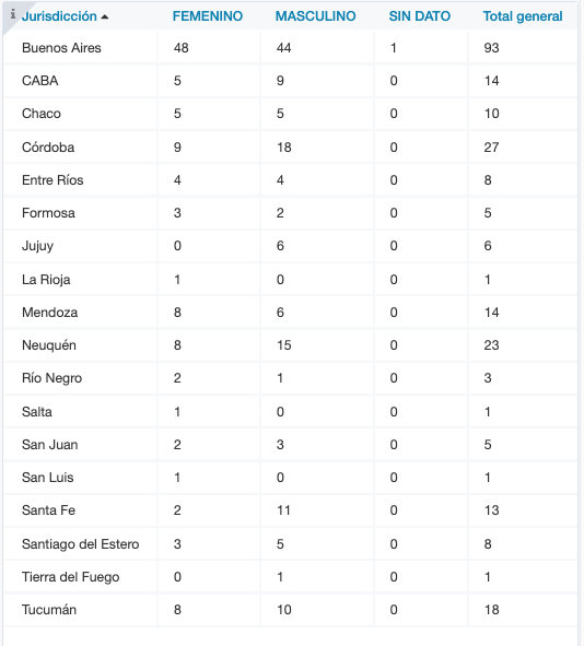 Del total de muertes, 140 son hombres (44 de la provincia de Buenos Aires, 9 de la ciudad de Buenos Aires, 5 de Chaco, 18 de Córdoba, 4 de Entre Ríos, 2 de Formosa, 6 de Jujuy, 6 de Mendoza, 15 de Neuquén, 1 de Río Negro, 3 de San Juan, 11 de Santa Fe, 5 de Santiago del Estero, 1 de Tierra del Fuego y 10 de Tucumán) y 110 son mujeres (48 de la provincia de Buenos Aires, 5 de la ciudad de Buenos Aires, 5 de Chaco, 9 de Córdoba, 4 de Entre Ríos, 3 de Formosa, 1 de La Rioja, 8 de Mendoza, 8 de Neuquén, 1 de Salta, 1 de San Juan, 2 de Río Negro, 1 de San Luis, 2 de Santa Fe, 3 de Santiago del Estero y 8 de Tucumán). Una persona fallecida de la provincia de Buenos Aires fue registrada sin datos de sexo.