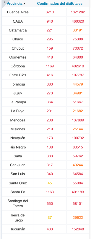 El total de acumulados por distrito indica que la provincia de Buenos Aires suma 1.821.282 casos; la Ciudad de Buenos Aires, 460.320; Catamarca, 33.191; Chaco, 75.308; Chubut, 70.072; Corrientes, 64.800; Córdoba, 402.610; Entre Ríos, 107.787; Formosa, 44.579; Jujuy, 34.981; La Pampa, 51.667; La Rioja, 21.682; Mendoza, 137.889; Misiones, 25.144; Neuquén, 100.792; Río Negro, 83.515; Salta, 59.762; San Juan, 49.244; San Luis, 64.584; Santa Cruz, 55.084; Santa Fe, 401.183; Santiago del Estero, 58.101; Tierra del Fuego, 29.622; y Tucumán, 152.048.