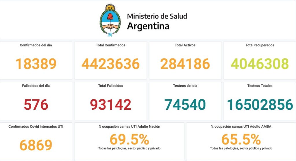 El informe nacional del Ministerio de Salud de Nación anunció que 576 personas fallecieron y 18.389 fueron reportadas con coronavirus. Son 6.869 los internados con coronavirus en unidades de terapia intensiva, con un porcentaje de ocupación de camas de adultos de 69,5% en el país. Con estos datos, el total de casos desde el inicio de la pandemia asciende a 4.423.636 y las víctimas fatales son 93.142.