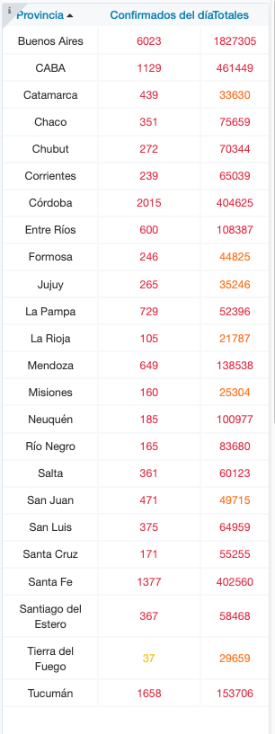 De los 18.389 nuevos casos, 6.023 son de la provincia de Buenos Aires, 1.129 de la ciudad de Buenos Aires, 439 de Catamarca, 351 de Chaco, 272 de Chubut, 239 de Corrientes, 2.015 de Córdoba, 600 de Entre Ríos, 246 de Formosa, 265 de Jujuy, 729 de La Pampa, 105 de La Rioja, 649 de Mendoza, 160 de Misiones,185 de Neuquén, 165 de Río Negro, 361 de Salta, 471 de San Juan, 375 de San Luis, 171 de Santa Cruz, 1.377 de Santa Fe, 367 de Santiago del Estero, 37 de Tierra del Fuego y 1.658 de Tucumán.