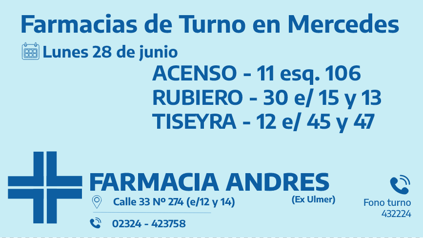 Desde las 8:30 del día de hoy hasta la misma hora de mañana, las farmacias de turno en Mercedes son: Acenso, Rubiero y Tiseyra.