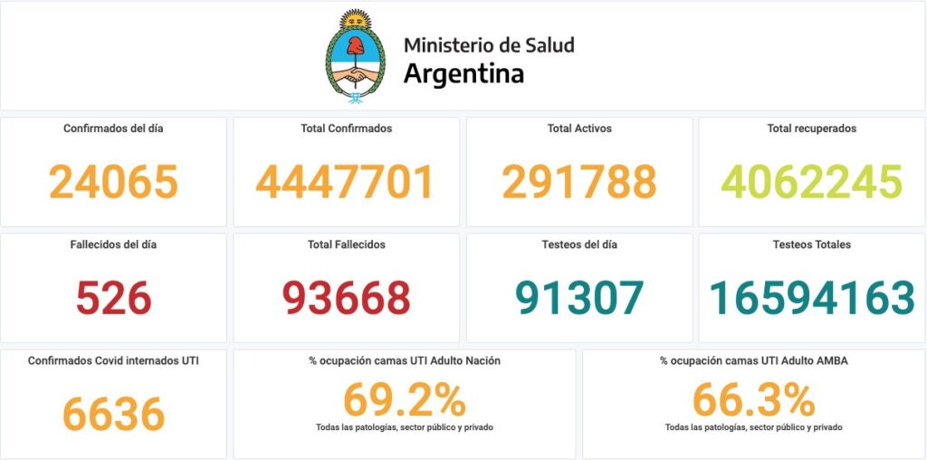 El Ministerio de Salud de la Nación informó que 256 personas fallecieron por el virus, mientras que 24.065 recibieron su resultado positivo de covid. Con estos datos, el total de casos desde el inicio de la pandemia asciende a 4.447.701 y las víctimas fatales son 93.668.