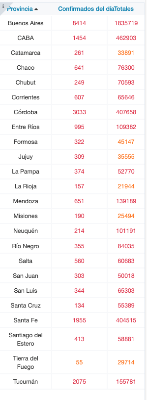 El total de acumulados por distrito indica que la provincia de Buenos Aires suma 1.835.719 casos; la Ciudad de Buenos Aires, 462.903; Catamarca, 33.891; Chaco, 76.300; Chubut, 70.593; Corrientes, 65.646; Córdoba, 407.658; Entre Ríos, 109.382; Formosa, 45.147; Jujuy, 35.555; La Pampa, 52.770; La Rioja, 21.944; Mendoza, 139.189; Misiones, 25.494; Neuquén, 101.191; Río Negro, 84.065; Salta, 60.683; San Juan, 50.018; San Luis, 65.303; Santa Cruz, 55.389; Santa Fe, 404.515; Santiago del Estero, 58.881; Tierra del Fuego, 29.714 y Tucumán, 155.781.