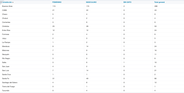 Del total de muertes, 374 son hombres (174 de la provincia de Buenos Aires, 22 de la ciudad de Buenos Aires, 4 Chaco, 2 de Chubut, 6 de Corrientes, 28 de Córdoba, 12 de Entre Ríos, 4 de Formosa, 3 de Jujuy, 2 de La Pampa, 14 de Mendoza, 9 de Misiones, 6 de Neuquén, 3 de Río Negro, 6 de Salta, 2 de San Juan, 14 de San Luis, 1 de Santa Cruz, 49 de Santa Fe, 8 de Santiago del Estero, 1 de Tierra del Fuego y 4 de Tucumán) y 260 son mujeres (113 de la provincia de Buenos Aires, 21 de la ciudad de Buenos Aires, 5 de Chaco, 2 de Chubut, 3 de Corrientes, 25 de Córdoba, 12 de Entre Ríos, 2 de Formosa, 2 de Jujuy, 1 de La Pampa, 9 de Mendoza, 7 de Misiones, 5 de Neuquén, 3 de Río Negro, 3 de Salta, 4 de San Juan, 7 de San Luis, 1 de Santa Cruz, 31 de Santa Fe y 4 de Santiago del Estero). Cuatro personas (dos de la provincia de Buenos Aires, una de la provincia de Mendoza y uan de la provincia de Salta) fueron registradas sin datos de sexo.