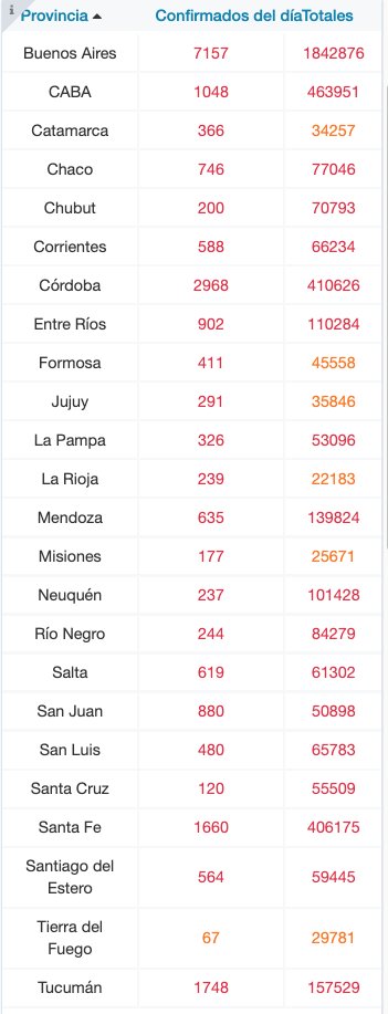 El total de acumulados por distrito indica que la provincia de Buenos Aires suma 1.842.876 casos; la Ciudad de Buenos Aires, 463.951; Catamarca, 34.257; Chaco, 77.046; Chubut, 70.793; Corrientes, 66.234; Córdoba, 410.626; Entre Ríos, 110.284; Formosa, 45.558; Jujuy, 35.846; La Pampa, 53.096; La Rioja, 22.183; Mendoza, 139.824; Misiones, 25.671; Neuquén, 101.428; Río Negro, 84.279; Salta, 61.302; San Juan, 50.898; San Luis, 65.783; Santa Cruz, 55.509; Santa Fe, 406.175; Santiago del Estero, 59.445; Tierra del Fuego, 29.781; y Tucumán, 157.529.