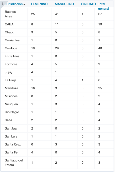 El parte precisó que fallecieron 41 hombres en la provincia de Buenos Aires; 11 en la Ciudad de Buenos Aires; 5 en Chaco; 29 en Córdoba; 5 en Formosa; 1 en Jujuy; 4 en La Rioja; 9 en Mendoza; 2 en Misiones; 3 en Neuquén; 1 en Río Negro; 2 en Salta; 1 en San Luis; 3 en Santa Cruz y 2 en Santiago del Estero. También fallecieron 25 mujeres en Buenos Aires; 8 en la Ciudad de Buenos Aires; 3 en Chaco; 1 en Corrientes; 19 en Córdoba; 1 en Entre Ríos; 4 en Formosa; 4 en Jujuy; 1 en La Rioja; 16 en Mendoza; 1 en Neuquén; 1 en Río Negro; 2 en Salta; 2 en San Juan; 1 en San Luis; 4 en Santa Fe y 1 en Santiago del Estero. Dos personas, una que residía en la provincia de Buenos Aires y otra en La Rioja, fueron registradas sin datos de sexo.