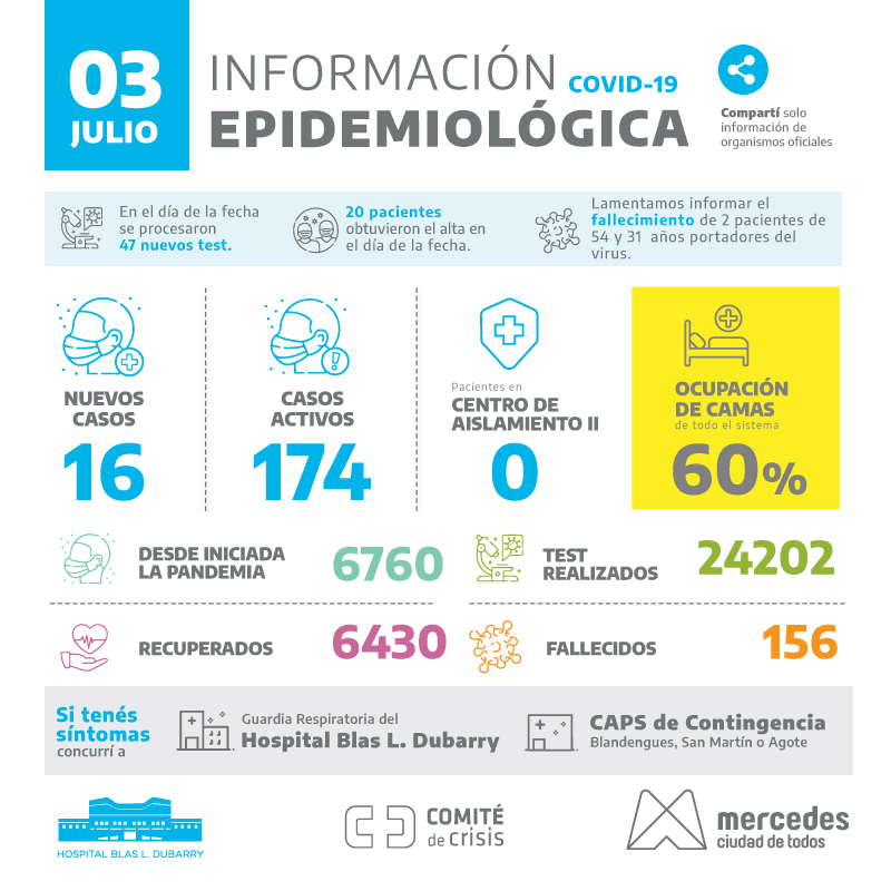 Lamentamos informar el fallecimiento de 2 pacientes portadores del virus. Además, se detectaron 16 nuevos positivos en 174 test efectuados en el laboratorio de virología molecular, siendo el reunionismo el principal factor de contagio.