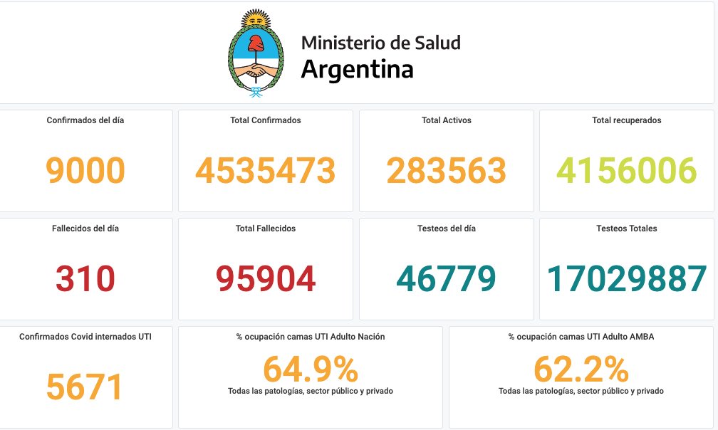 Según informó el Ministerio de Salud 310 personas fallecieron y 9.000 fueron reportadas con coronavirus en las últimas 24 horas en la Argentina, con lo que suman 95.904 los fallecidos registrados oficialmente a nivel nacional y 4.535.473 los contagiados desde el inicio de la pandemia. Son 5.671 los internados con coronavirus en unidades de terapia intensiva, con un porcentaje de ocupación de camas de adultos de 64,9% en el país.