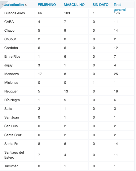 Del total de muertes reportadas hoy, 181 son hombres (Buenos Aires 109, Ciudad de Buenos Aires 7, Chaco 9, Córdoba 6, Entre Ríos 6, Jujuy 1, Mendoza 8, Neuquén 13, Río Negro 5, Salta 1, San Juan 1, San Luis 2, Santa Fe 6, Santiago del Estero 4 y Tucumán 1) y 127 son mujeres (Buenos Aires 66, Ciudad de Buenos Aires 8, Ciudad de Buenos Aires 4, Chaco 5, Chubut 2, Córdoba 6, Entre Ríos 1, Jujuy 3, Mendoza 17, Neuquén 5, Río Negro 1, Salta 2, Santa Fe 8 y Santiago del Estero 7). Dos personas, una que residía en la provincia de Buenos Aires y otra en la provincia de Misiones, fueron registradas sin datos de sexo.