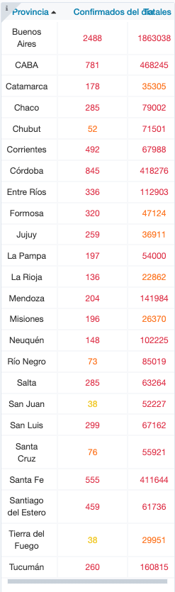 Este domingo se registraron en la provincia de Buenos Aires 2.488 casos; en la Ciudad de Buenos Aires, 781; en Catamarca, 178; en Chaco, 285; en Chubut, 52; en Corrientes, 492; en Córdoba, 845; en Entre Ríos, 336; en Formosa, 320; en Jujuy, 259; en La Pampa, 197; en La Rioja, 136; en Mendoza, 204; en Misiones, 196; en Neuquén, 148; en Río Negro, 73; en Salta, 285; en San Juan, 38; en San Luis, 299; en Santa Cruz, 76; en Santa Fe, 555; en Santiago del Estero, 459; Tierra del Fuego, 38; y en Tucumán, 260.