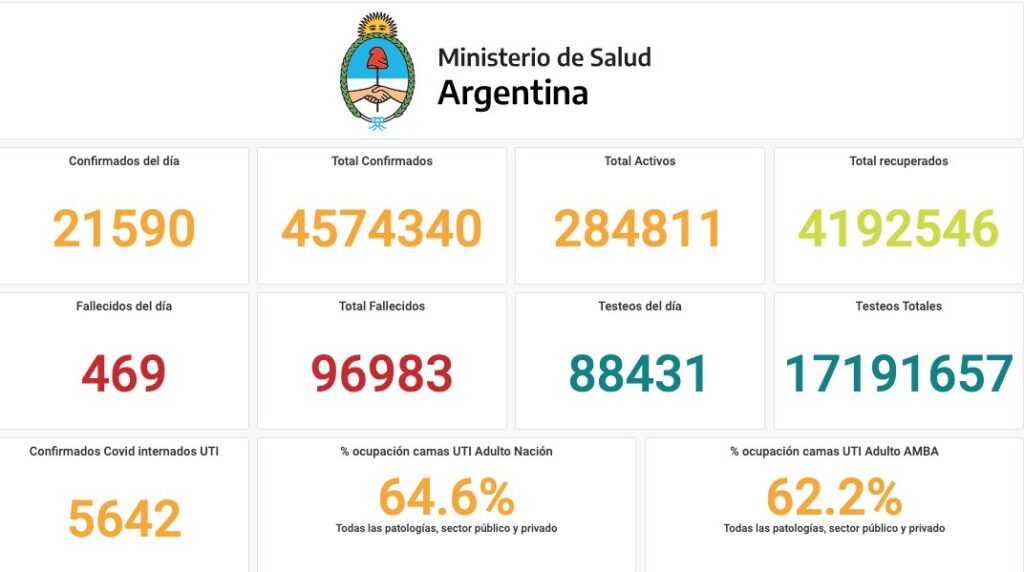 El Ministerio de Salud de Nación informó este martes 6 de julio se registró el fallecimiento de 469 personas y 21.590 fueron reportadas con coronavirus en las últimas 24 horas en la Argentina. Con esto se alcanza los 96.983 fallecidos registrados oficialmente a nivel nacional y 4.574.340 los contagiados desde el inicio de la pandemia.