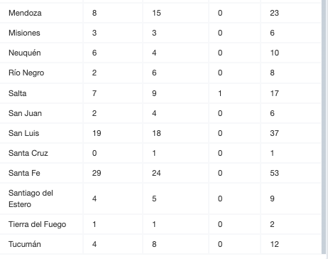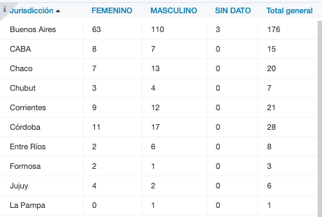En tanto, de las mujeres: Buenos Aires 63, Ciudad de Buenos Aires 8, Chaco 7, Chubut 3, Corrientes 9, Córdoba 11, Entre Ríos 2, Formosa 2, Jujuy 4, Mendoza 8, Misiones 3, Neuquén 6, Río Negro 2, Salta 7, San Juan 2, San Luis 19, Santa Fe 29, Santiago del Estero 4, Tierra del Fuego 1 y Tucumán 4.