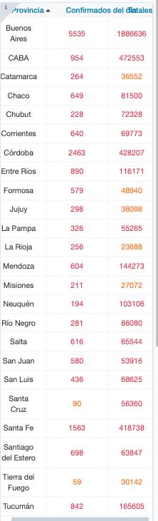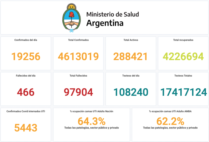 De los 19.256 contagios, 5.535 son de la provincia de Buenos Aires, 954 de la ciudad de Buenos Aires, 264 de Catamarca, 649 de Chaco, 228 de Chubut, 640 de Corrientes, 2.463 de Córdoba, 890 de Entre Ríos, 579 de Formosa, 298 de Jujuy, 326 de La Pampa, 256 de La Rioja, 604 de Mendoza, 211 de Misiones, 194 de Neuquén, 281 de Río Negro, 616 de Salta, 580 de San Juan, 436 de San Luis, 90 de Santa Cruz, 1.563 de Santa Fe, 698 de Santiago del Estero, 59 de Tierra del Fuego y 842 de Tucumán.