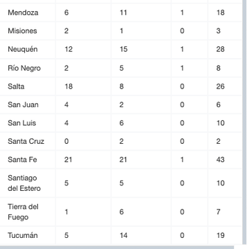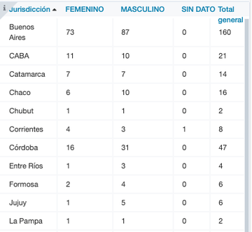 También fallecieron 73 mujeres en Buenos Aires; 11 en la Ciudad de Buenos Aires; 7 en Catamarca; 6 en Chaco; 1 en Chubut; 4 en Corrientes; 16 en Córdoba; 1 en Entre Ríos; 2 en Formosa; 1 en Jujuy; 1 en La Pampa; 6 en Mendoza; 2 en Misiones; 12 en Neuquén; 2 en Río Negro; 18 en Salta; 4 en San Juan; 4 en San Luis; 21 en Santa Fe; 5 en Santiago del Estero; 1 en Tierra del Fuego y 5 en Tucumán.