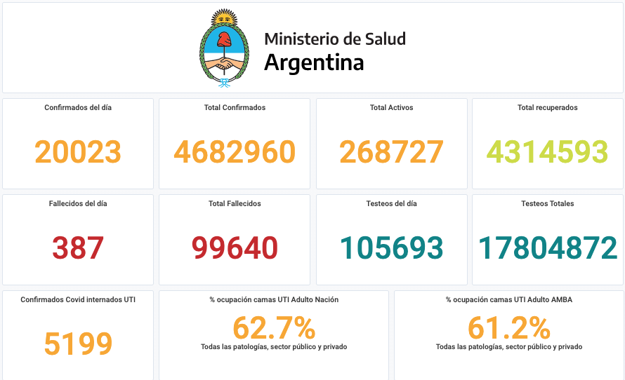El Ministerio de Salud de la Nación informó este martes 13 de julio que, en las últimas 24 horas, se registraron 387 fallecimientos y 20.023 nuevos contagios de coronavirus. Con estos datos, el total de casos desde el inicio de la pandemia asciende a 4.682.960 y las víctimas fatales son 99.640.