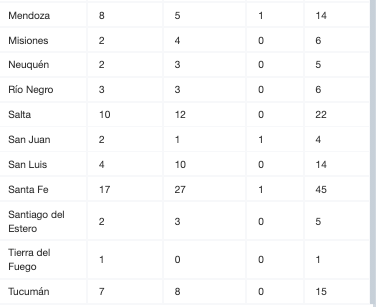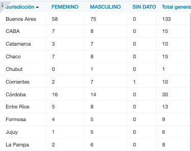 También fallecieron 58 mujeres en Buenos Aires; 7 en la Ciudad de Buenos Aires; 3 en Catamarca; 7 en Chaco; 2 en Corrientes; 16 en Córdoba; 5 en Entre Ríos; 4 en Formosa; 1 en Jujuy; 2 en La Pampa; 8 en Mendoza; 2 en Misiones; 2 en Neuquén; 3 en Río Negro; 10 en Salta; 2 en San Juan; 4 en San Luis; 17 en Santa Fe; 2 en Santiago del Estero; 1 en Tierra del Fuego; y 7 en Tucumán.