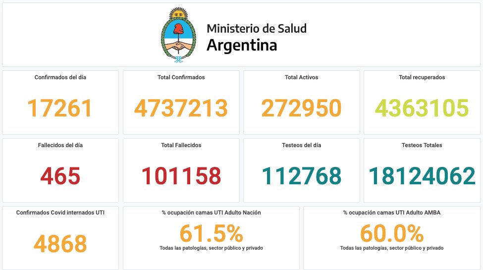 El Ministerio de Salud de la Nación informó este viernes 16 de julio que, en las últimas 24 horas, se registraron 465 muertes y 17.261 nuevos contagios de COVID-19. Con estos datos, el total de casos desde el inicio de la pandemia asciende a 4.737.213 y los fallecimientos son 101.158.